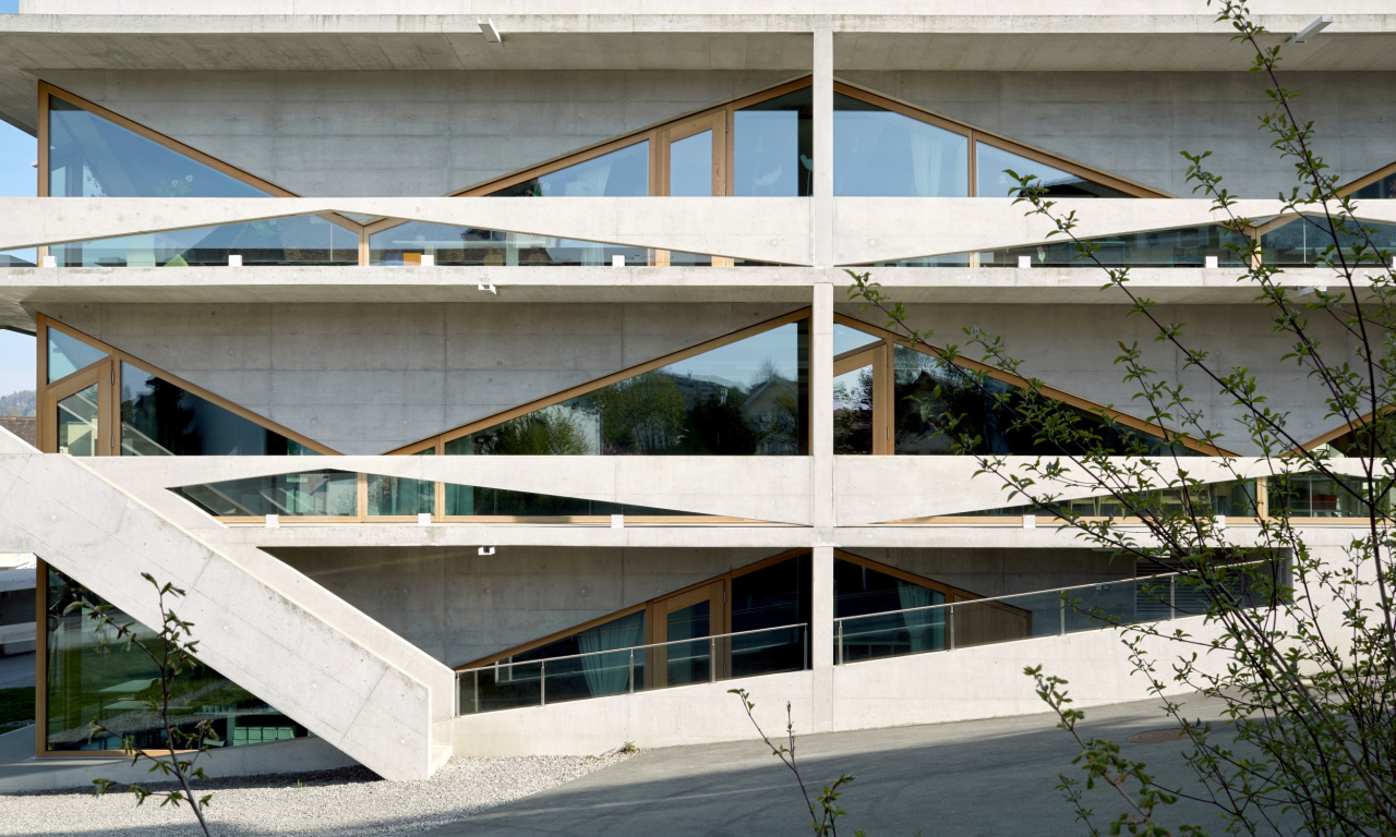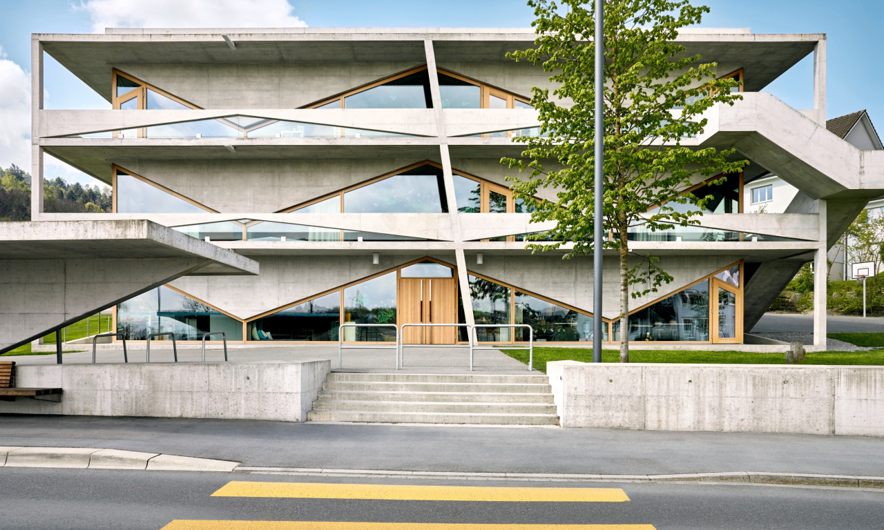 Beim Schulhaus in Buechen überlagern sich dünne äussere Stützen mit den dreieckig geschnittenen Überzugswandscheiben auf den massiven Innenstützen und bilden so eine raumhaltige Fassadenschicht, die als qualitätsvoller Filter wirkt.